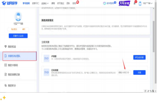 2.点击左侧“ 关联机构/团队 ” ,选择口令关联 ,输入6位口令(7HBJ9S) ,点击“ 关联 ”(请勿使用IP 绑定)。